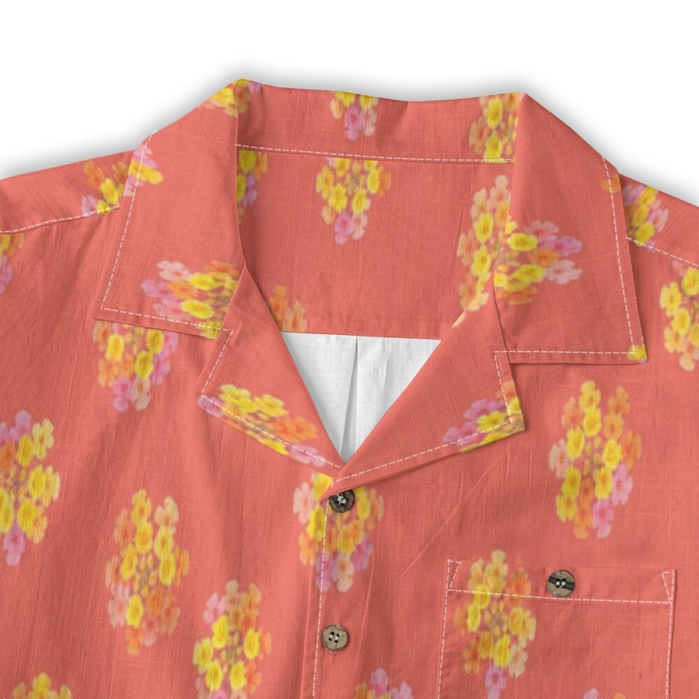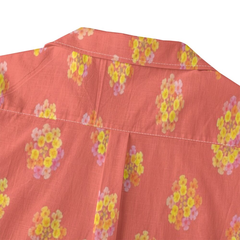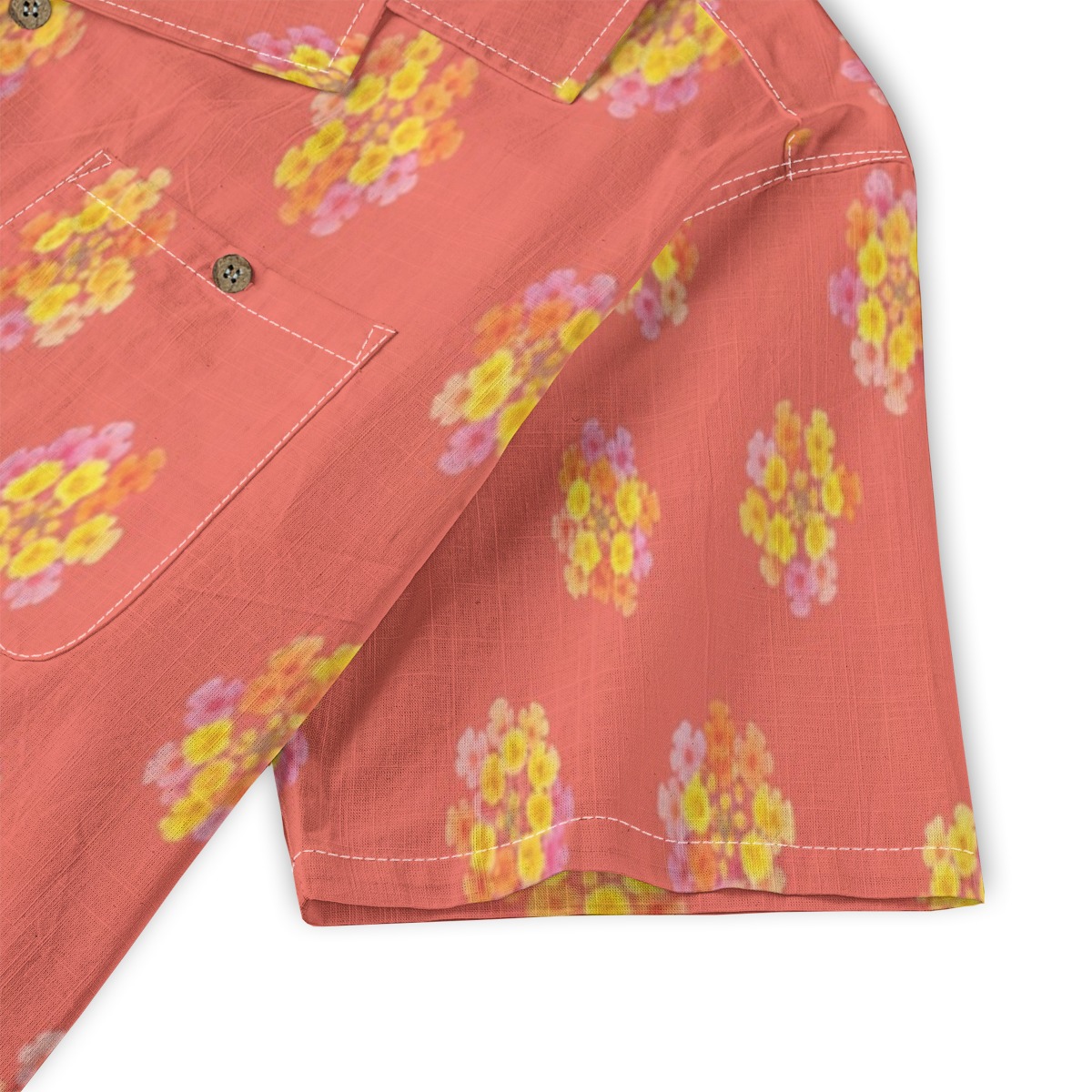 Colorful lantana clusters spread across a warm coral base, bringing a lively burst of tropical hues. The mix of orange, yellow, and pink creates a cheerful palette, while the even spacing keeps the pattern cohesive and bright.