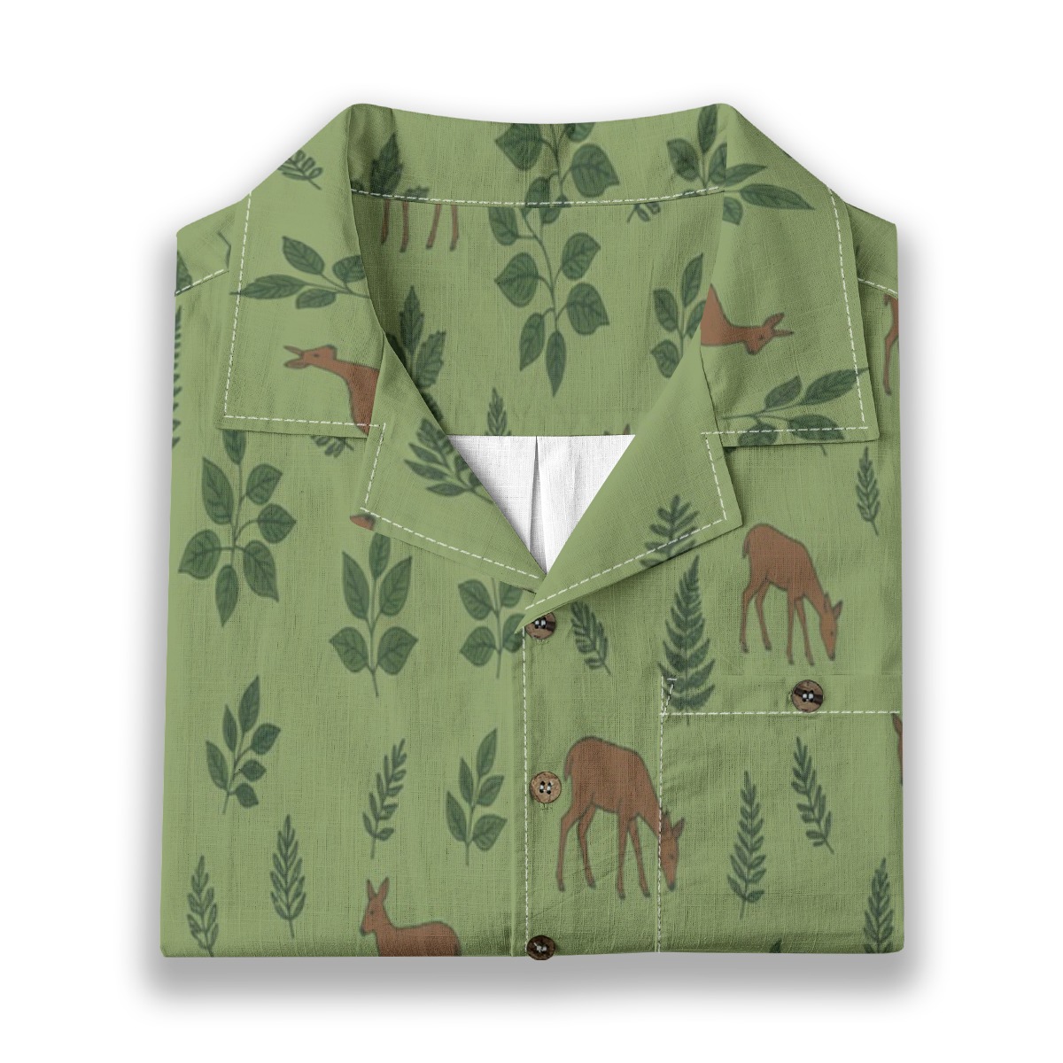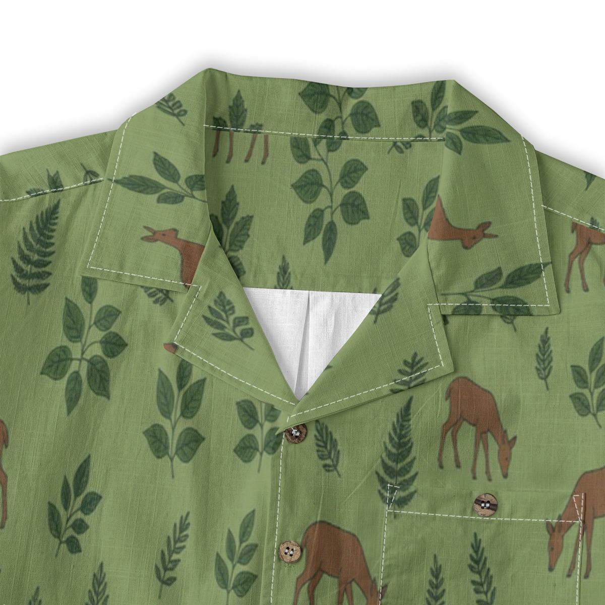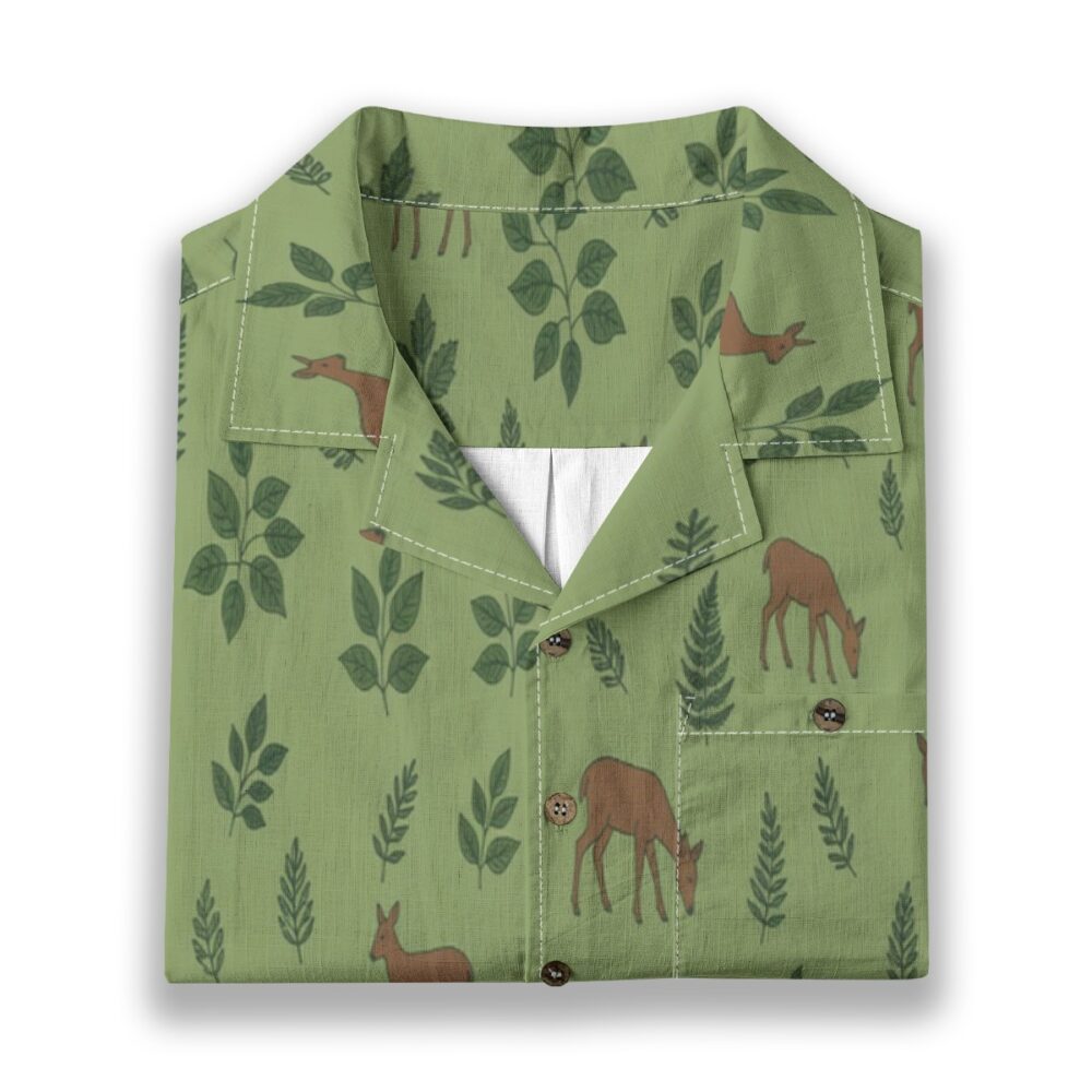 Delicate musk deer appear among soft forest leaves, forming a peaceful and natural pattern. The moss green background blends seamlessly with earthy browns, creating a calm woodland feel. Even spacing adds balance and gentle movement.