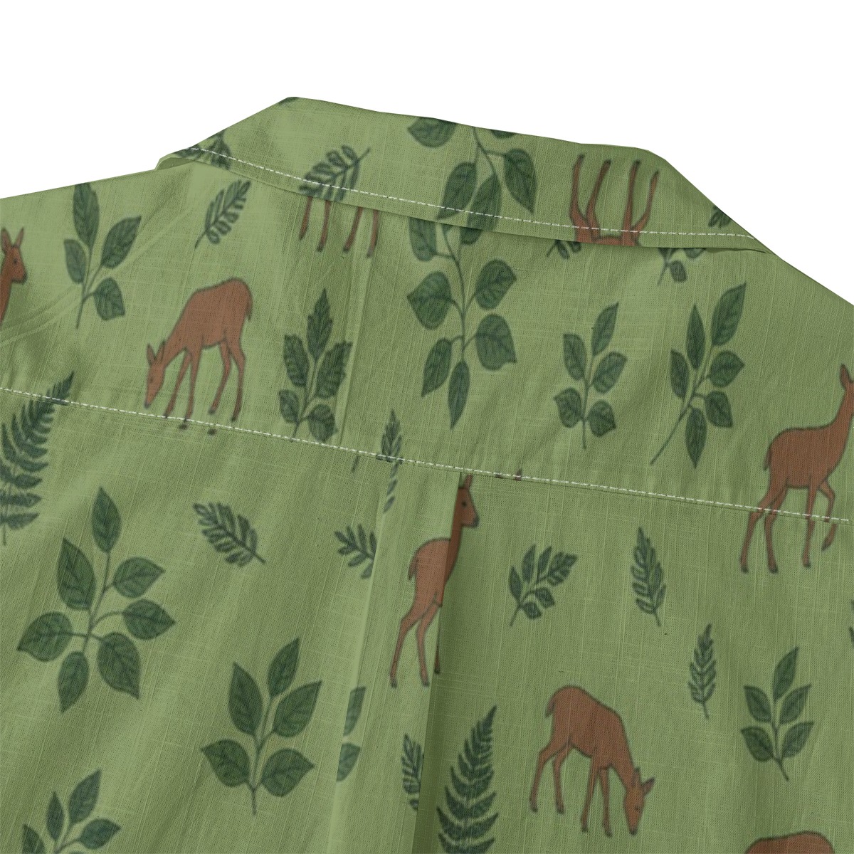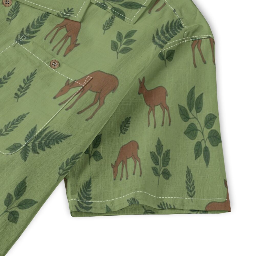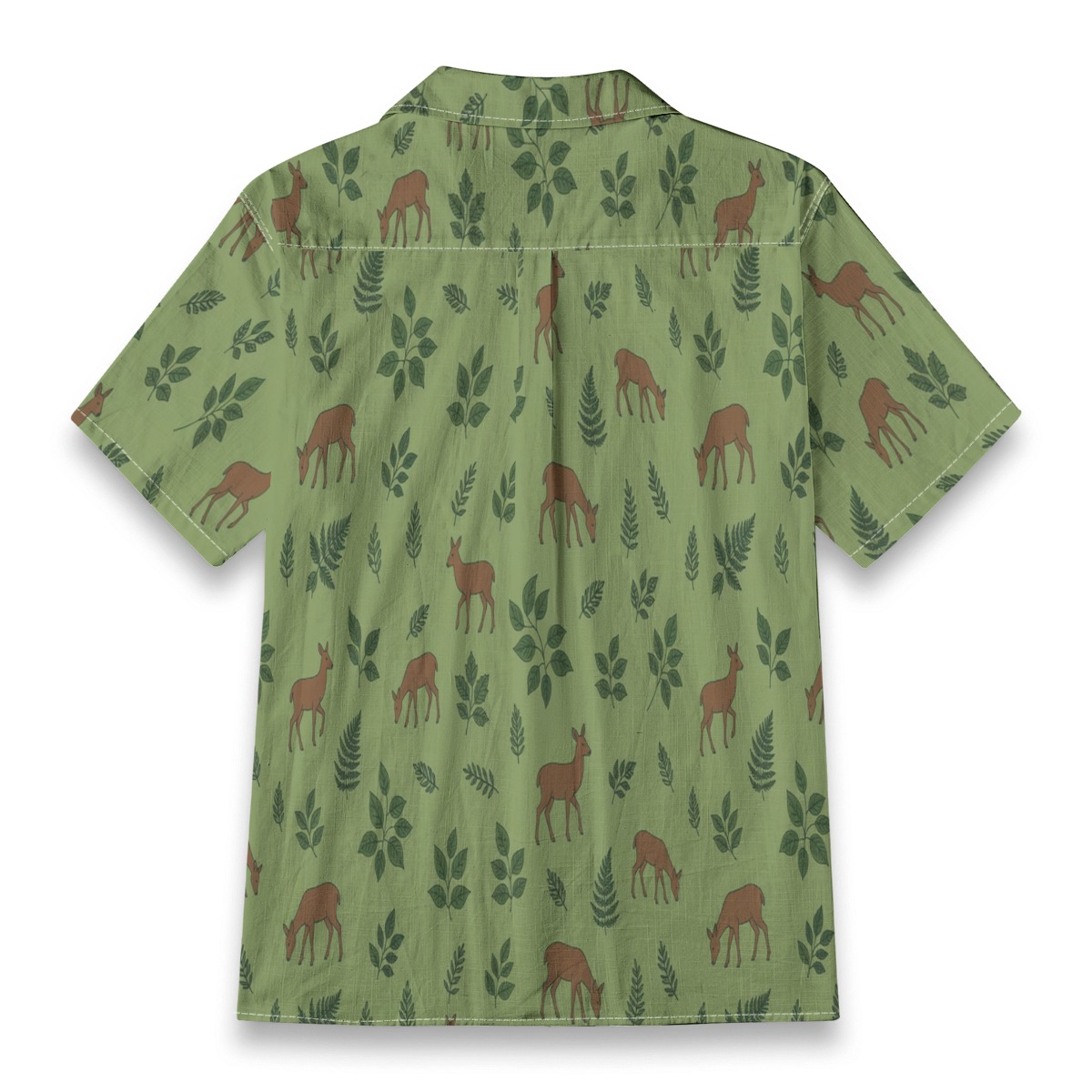 Delicate musk deer appear among soft forest leaves, forming a peaceful and natural pattern. The moss green background blends seamlessly with earthy browns, creating a calm woodland feel. Even spacing adds balance and gentle movement.